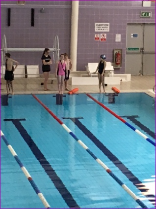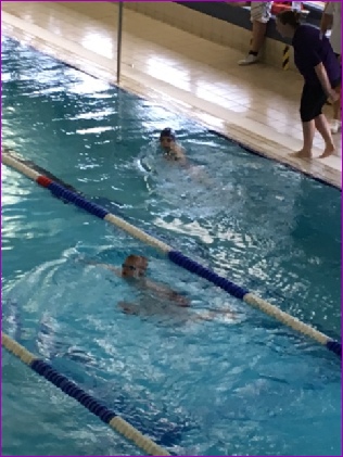 Pictured right: Alisha and Libbie at the start of the rescue tube relay and Libbie and Milo swimming side stroke.